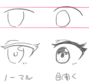 縦の方向にパースがかかります。目全体は少し横長になります。