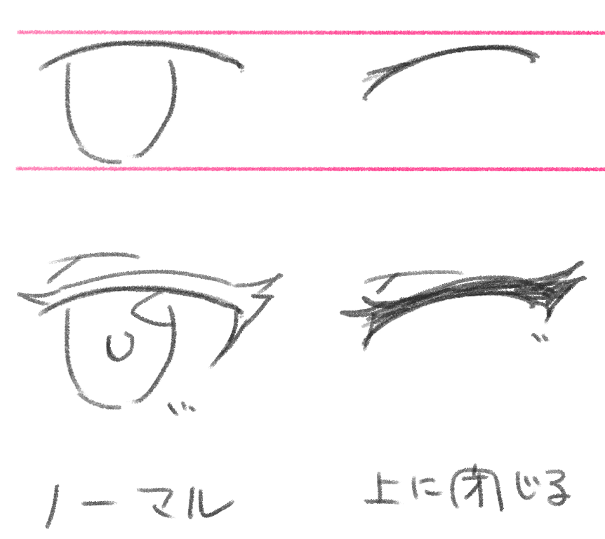 ウインクや笑っているとき、反射的に目を瞑る時など感情を出したいときはこちらのパターンの閉じ方で描きます。