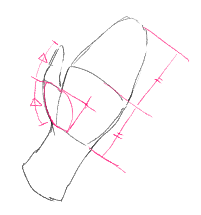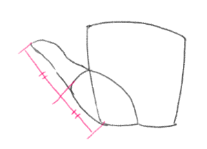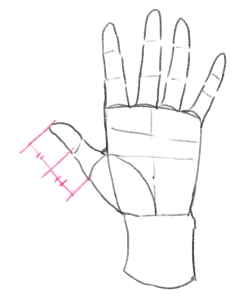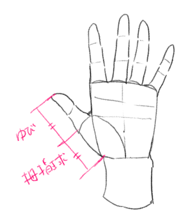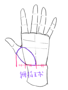 親指も描いてみましょう。長さは拇指球と同じくらいです(ポイント③)