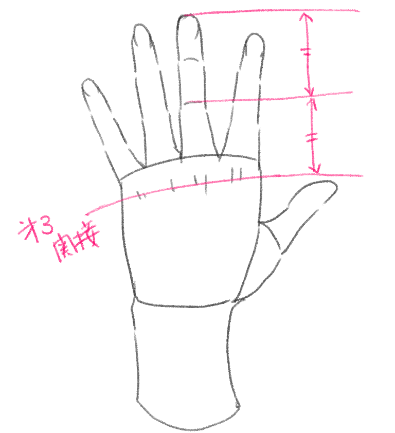手の甲側から見ると指先から第2関節までと、指の付け根まではほぼ同じ長さです。