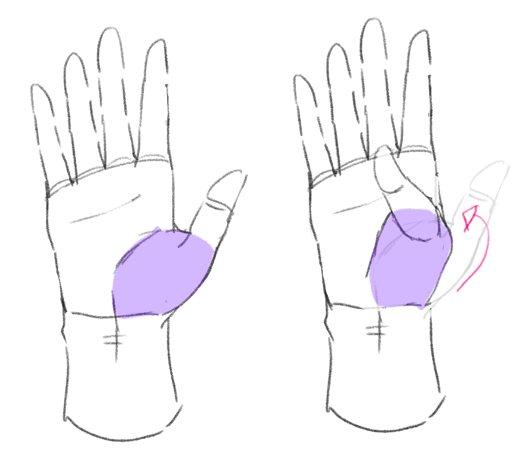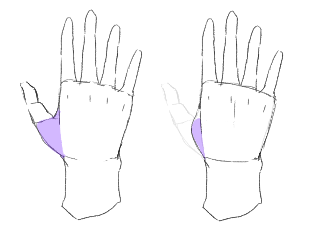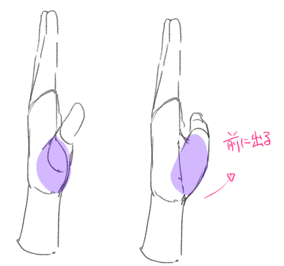 親指は拇指球と呼ばれる付け根のパーツがよく動きます。描きながら動く範囲を覚えていきましょう。