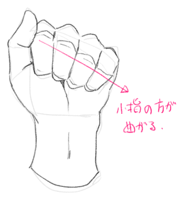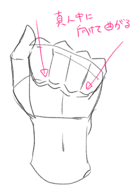 また、握ったときは指が真ん中に向けて曲がるので意識して描いてみましょう