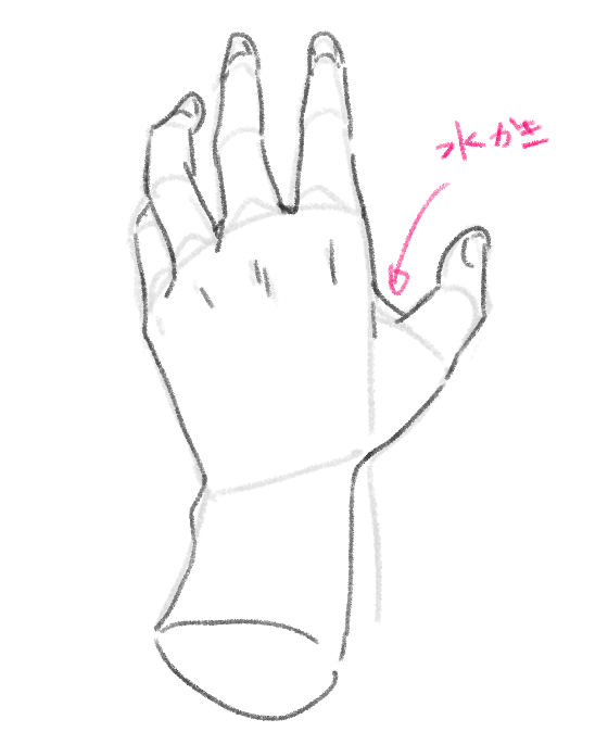 小指側の手のひらは握ると曲線になります。各指の関節は比率を思い出しながら描いてみてください。